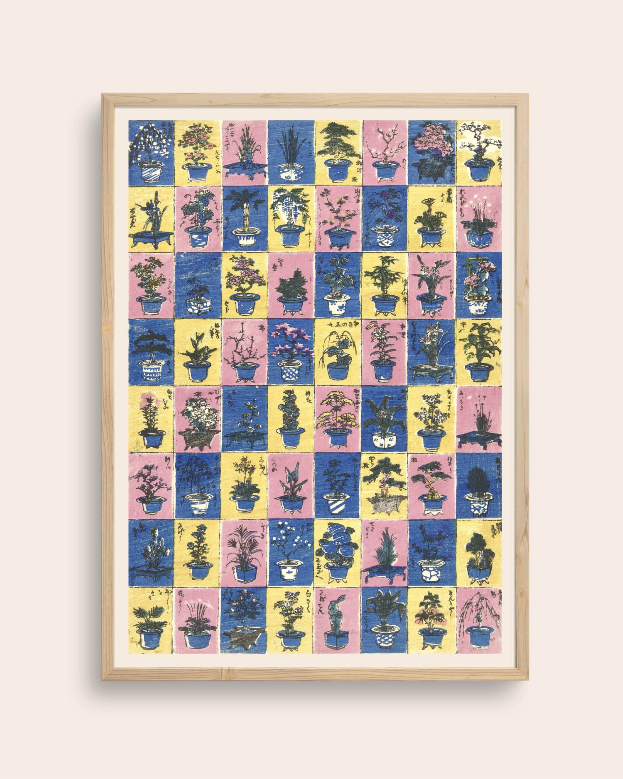 Japanske blomster i blå, rosa og gule felter. Bonsai () er japanske miniature træ.Læs mere om japanske træsnit, ukiyo-e, her.
